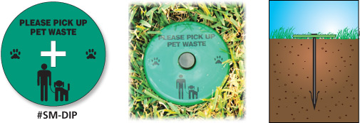 Place a message directly where pets do their business - in the  grass.  Our das Soil Markers are durable, low profile, and vandal  resistant.  Drive the 13” stake through the center of the 7” soil marker for a bright, highly visible, ground-level message.